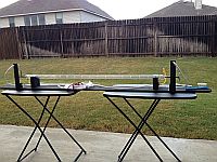 - At one end of the hallway, place your mirror on the floor (hopefully it's not carpeted). Farther away, as far as possible (maybe use your backyard), place the laser pointer on the floor and spread the beam so it covers the entire mirror. Fiddle with the aiming until you get a spot reflected back that you can work with. It is important that the laser pointer be beyond the focal length of the mirror. If the pointer is inside the focal length, the mirror will actually spread the beam (act like a convex mirror). It's also important to keep the angle between the laser pointer and reflected beam small.