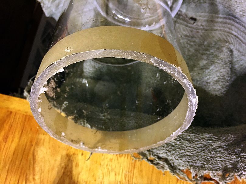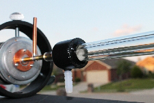 Although the tape method is not my own idea, it was my idea to use masking tape for this purpose. Unlike some of the other common types of tape, masking tape is cheap, and it combines evenly as it is rolled onto a cylinder-shaped surface. Once complete, the masking tape roll can be coated with epoxy and sealants in order to provide strength and protection. I coated my entire tape roll with JB weld, and then sealed the outside with shellac. See the pics below for an example. As you have probably noticed in the previous photo, there is a seperate tape-wrap on the tip of the glass tubing. Although it is a bit premature to mention this, it will eventually serve as a spacer to couple the outside of the glass tubing to the inside of a section of copper pipe, which will serve as one of the two discharge tube electrodes. For now, ignore this step. It only became necessary for me to mention, in an effort to avoid potential confusion.