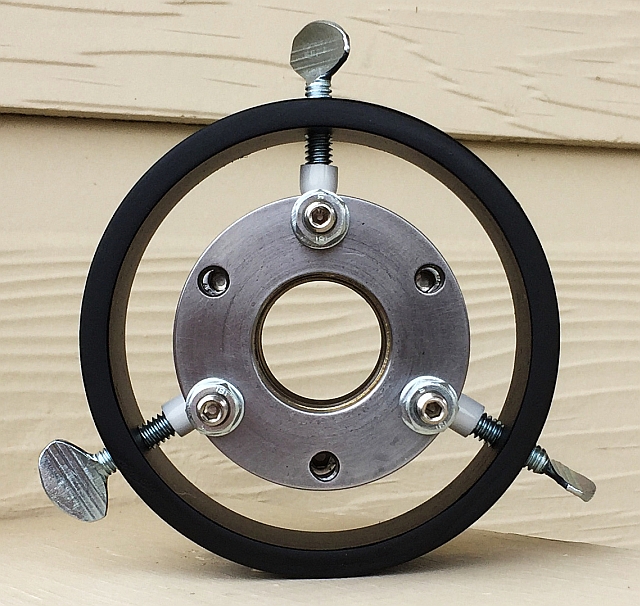 Some detail of end piece construction is shown above. Most of my work was done using JB weld, but the builder might prefer to use solder, brazing, or welding provided these resources and skills are readily available. Either way, the idea is to get a metal washer centered around a short section of copper pipe. The pipe can be about 3 or 4 inches long. You want washers that are big enough so that you can drill holes and mount the adjustment bolts and screws near the outside edge. At the same time, you want the inside hole to be as close as possible to the diameter of the outside of the copper pipe. My approach was to combine smaller washers with the larger ones, in order to more easily couple everything together. The pictures below show how small washers can be combined with larger ones, in an effort to make the hole in the middle 'smaller' so that it will come closer to fitting around something that will pass through the center. Look at these pictures very carefully, but be aware that they are used only as an example. A range of different sizes can work. The deminsions of these parts should be based upon availability, and how easily they can be adapted to the other parts (like the copper pipe) that you are able to locate.