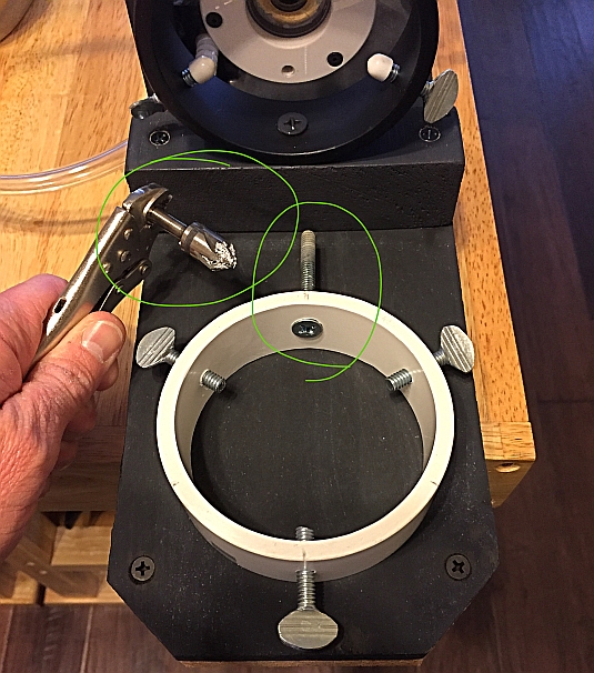 the two previously flattened pennies epoxied to 5/8" nuts (or aluminum hard drive platters epoxied to nuts) a small drill press vise (this vise is flat on the bottom and meant to be bolted to a drill press, a five pounder is good) Turtle Wax RUBBING Compound (the brand is not important but it must be rubbing compound - polishing compound takes a longer time) paper towels plenty of free time, a good movie, a good wife, and a sandwich wouldn't hurt CAUTION!: Do not use buffing sticks (emery, tripoli, white or red rouge) meant for cotton buffing wheels mounted on bench grinders. Although the grit is good the wax binder is awful and will cake-up and cause slipping which equals scratching. I haven't tried real grits used to grind telescope mirrors but they may work. Remember grit size determines focal length. It is really easy to grind in a curve that is too deep. I would go straight for the cerium oxide or rouge. We are only removing ten-thousandths of an inch from the center!!! It's better to think of polishing out a mirror NOT grinding out a mirror.