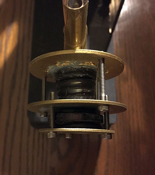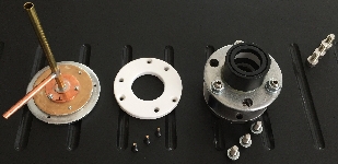 Rather than using washers and o-rings for #7 as depicted above, I decided to cannibalize #5 for its state of the art bellows. The following pictures present the sequence of assembly. I had originally painted one pair of steel washers gold, so that they would approximate the color of the adjacent copper parts. After deciding to use the bellows however, I chose to remove the gold paint. The following eleven pictures were taken before the gold paint was removed. In an attempt to make it look more like the original steel, I colored the washers with a grayish color using post-photograph software (opting for a 'quick-fix' approach rather than taking the time to carefully and realistically change the color using raster graphics). So please pardon the resulting poor quality.