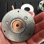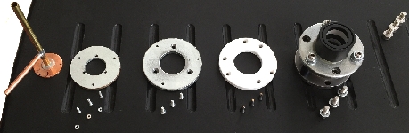 Once you have two pairs of washers that fasten tightly together using six hex bolts, then you are ready for the next step. The holes in the middle of my washers were much larger than the outside diameter of the copper pipe sections used for electrodes. The holes were also significantly larger than the outside diameter of my resonator mirrors. So I needed some way to 'step' these holes down, before taking up the slack with the tape method. The tape method would probably be acceptable for creating a spacer between one washer from each of the two pairs, and a corresponding copper pipe electrode; but I preferred something with a smaller profile for the purpose of mounting the resonator optics. Look at the picture below. You will notice that a small additional 'insert' washer was placed over the center of the larger washer. This 'insert' washer takes up the space between the larger washer and the tiny output mirror.