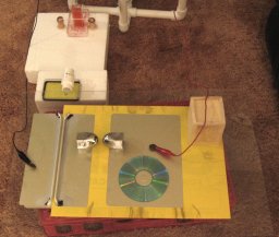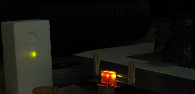 If attempting to lase laundry detergent with an air laser, I recommend using a fluorescent target. Best results can be obtained using a fluorescent target with a really bright color, such as yellow. In the absence of such a target, the dye output will be very difficult to see. In the photos where the target was not used, the spot from the dye appears as a dull purple spot. If I remember correctly I used a 30s shutter speed to make the following three photos, so they represent several superimposed pulses. To the eye, they are therefore considerably fainter than they appear in these photographs.