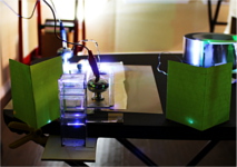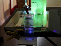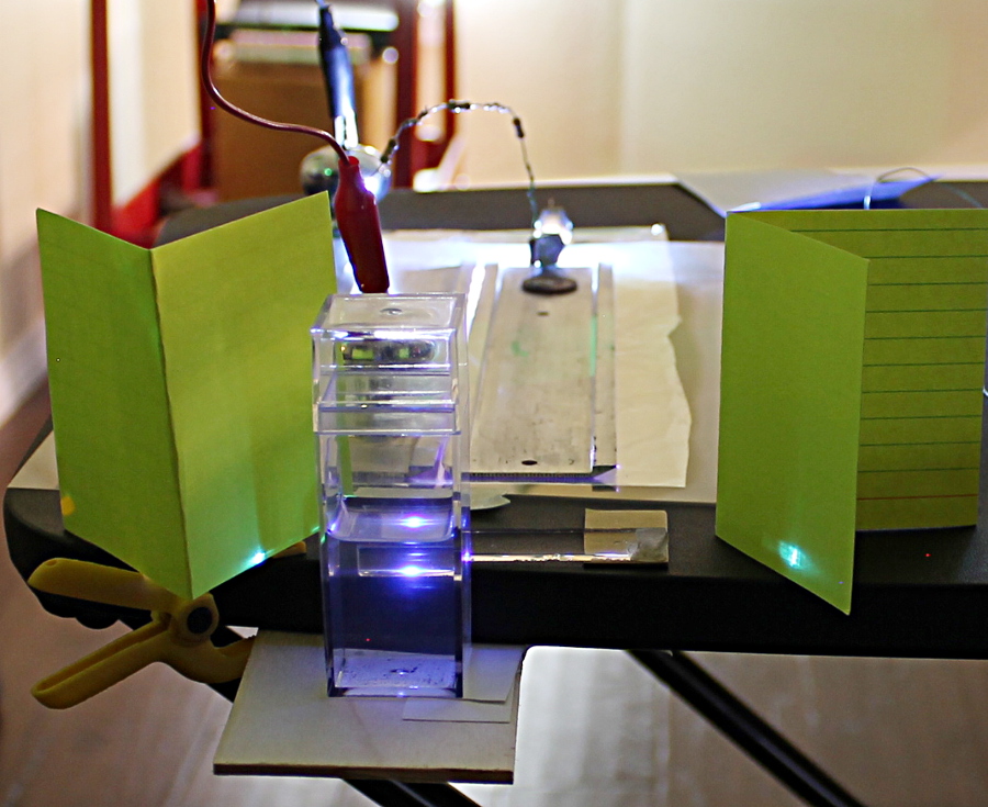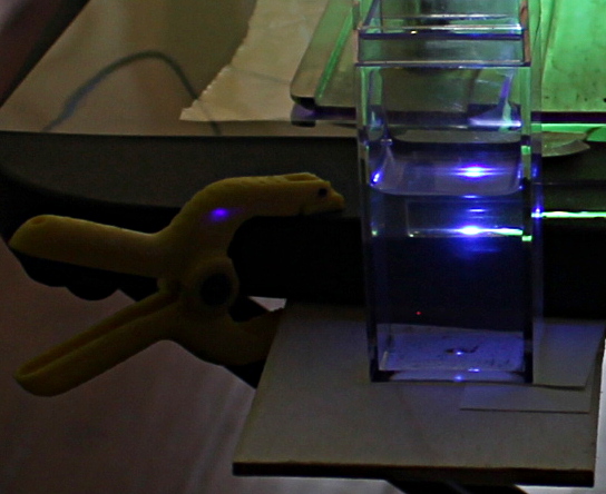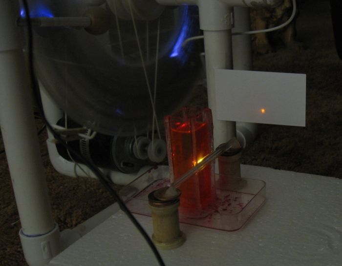 Here is a photo of Rhodamine 6G in 91% isopropyl alcohol, in a homemade cuvette, pumped by a homemade TEA nitrogen laser. It marks the first time I have been able to use one of my nitrogen lasers to lase an organic dye
