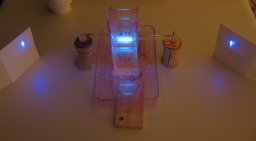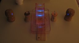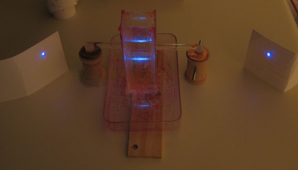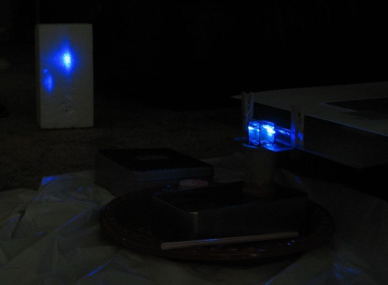 Here are some photos showing the difference in output. Each picture shows four or five pulses from the TEA nitrogen laser hitting a cuvette of 4-Methyl-Umbelliferone. The output of the dye is shown on paper and on cork. The upper two photos were taken with air in the laser, and the lower two are with nitrogen. As you can see, nitrogen works a lot better!