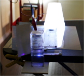 The cuvette is made of four microscope coverslips, epoxied together and epoxied onto a microscope slide.